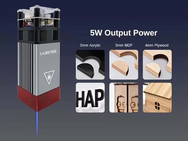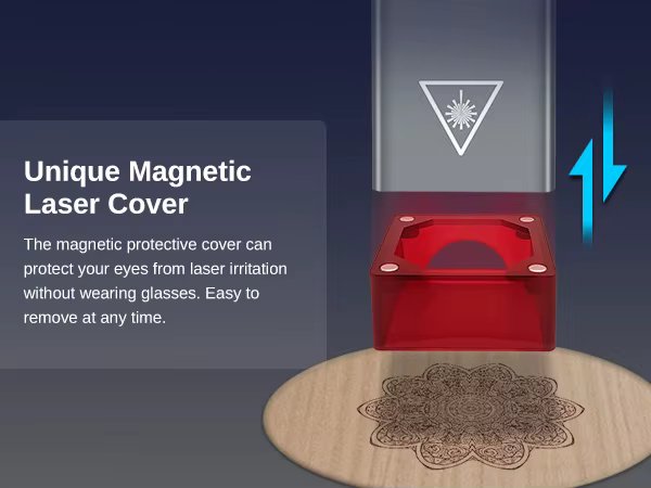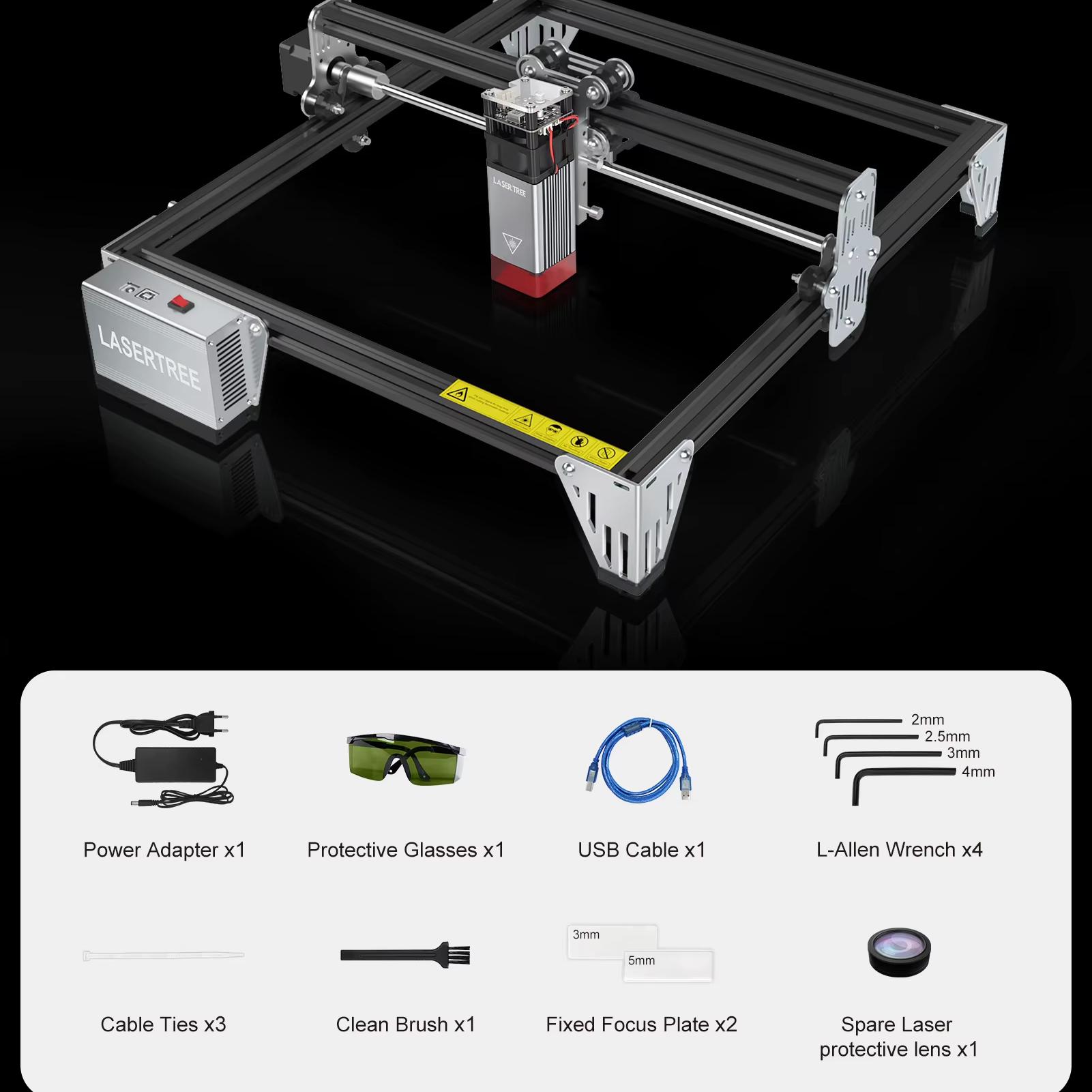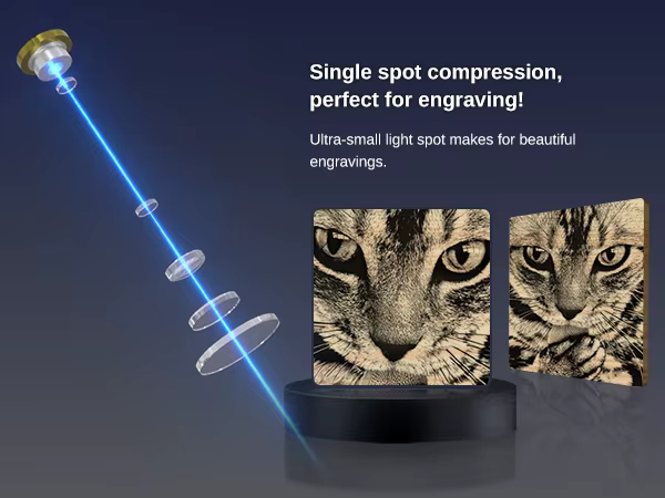 La machine est équipée d’un laser optique de 5W (±1W) à longueur d’onde de 450 nm, capable d’atteindre une vitesse de gravure jusqu’à 6000 mm/min, augmentant considérablement la productivité tout en maintenant une haute précision. Le réglage de la mise au point s’effectue facilement grâce à une molette de réglage manuel.